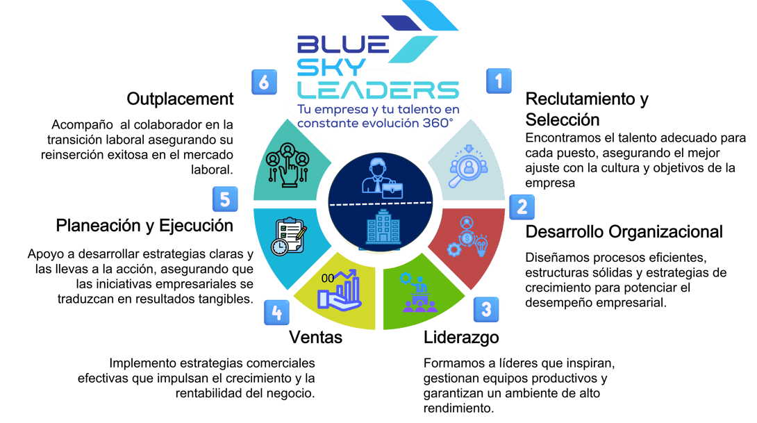 En Blue Sky Leaders no solo ofrecemos capacitación aislada, sino que abordamos el desarrollo de tu empresa desde todos los ángulos clave: liderazgo, ventas, reclutamiento y organización. Nuestro enfoque integral asegura que cada solución esté conectada estratégicamente con el crecimiento y éxito de tu negocio.